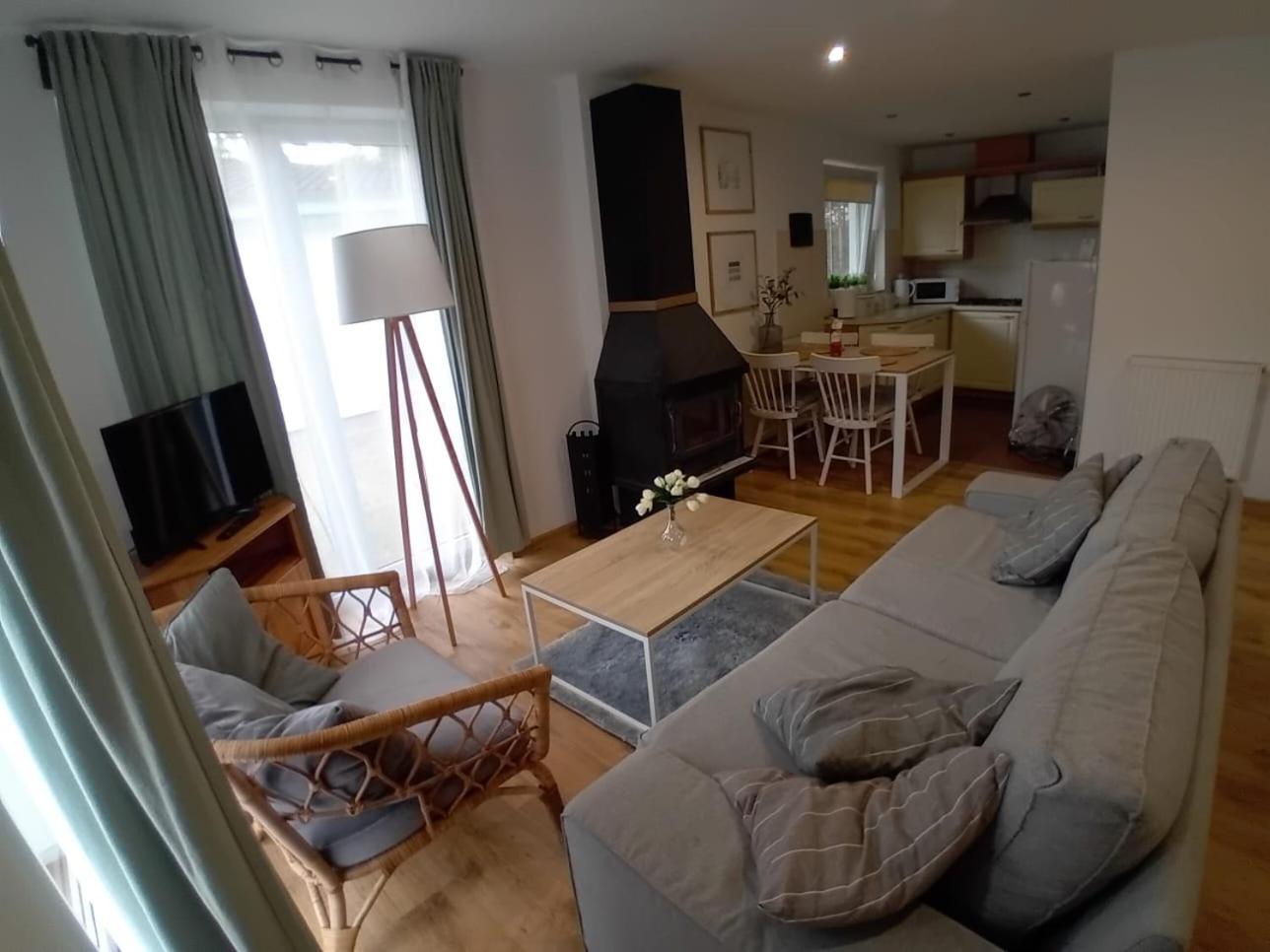 Dom z 2 sypialniami. This holiday home features a fireplace. This holiday home features 1 living room, 2 separate bedrooms and 1 bathroom with a shower and a hairdryer. Guests will find a stovetop, a refrigerator, kitchenware and a microwave in the well-fitted kitchen. The holiday home also comes with a barbecue. A seating area with a flat-screen TV, a dining area and a terrace are offered in this holiday home. The unit has 2 beds. Dom wakacyjny - 5 osobowy. Powierzchnia pokoju ok.: 50 mkw.